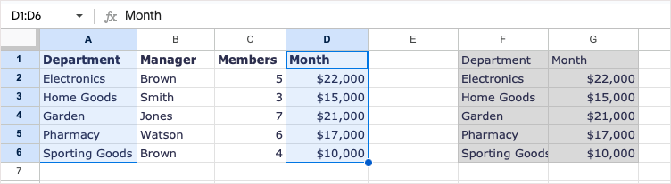 Korzystając z tablicy od A1 do D6, możemy zwrócić kolumny 1 (kolumna A) i 4 (kolumna D) za pomocą następującej formuły: