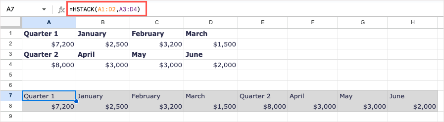 Dwie ostatnie funkcje, którym się przyjrzymy, dotyczą dołączania tablic. Dzięki HSTACK i VSTACK możesz dodać dwa lub więcej zakresów komórek, tworząc pojedynczą tablicę, poziomo lub pionowo.