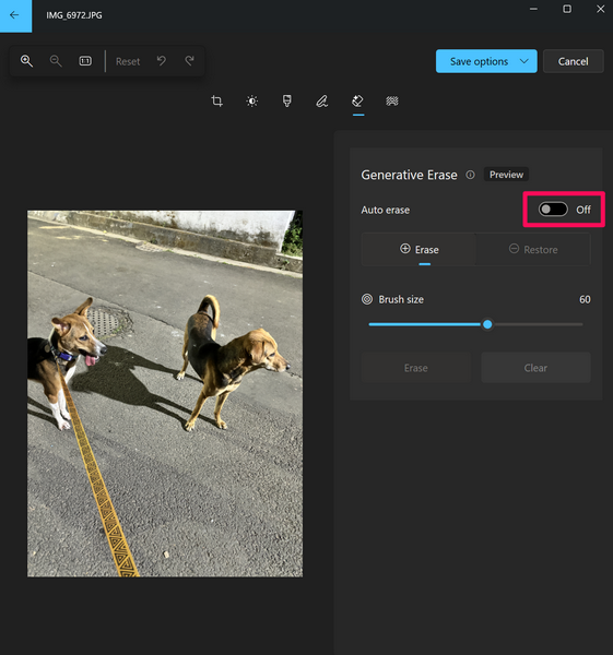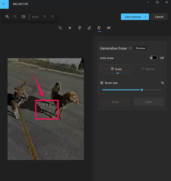 5.Teraz kliknijikona gumkina górnym pasku dootwórz narzędzie do wymazywania generatywnegodla obrazu w aplikacji Zdjęcia.