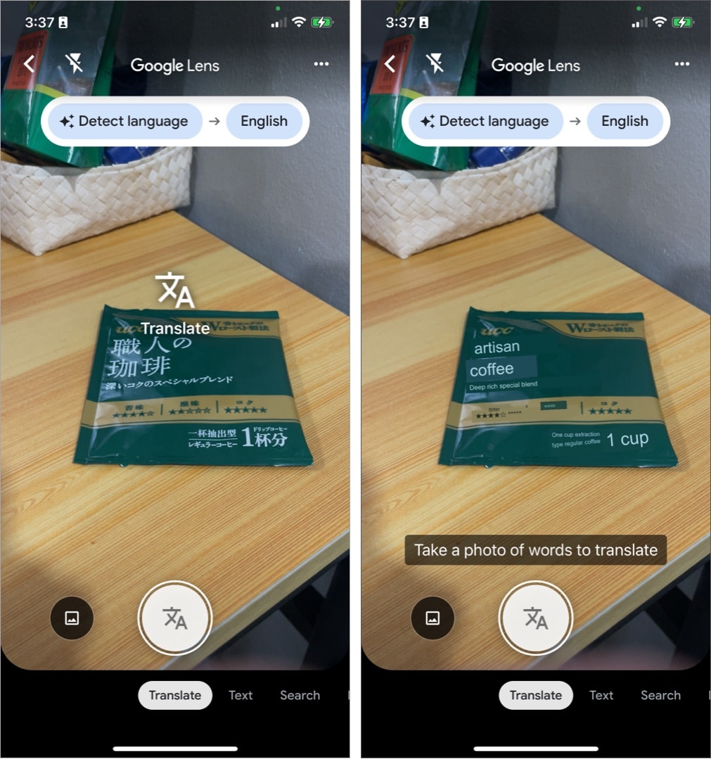 Po prostu umieść aparat przed przedmiotem, który chcesz przetłumaczyć. Automatycznie wykrywa język i pozwala przetłumaczyć go na inny język. Kliknij język po prawej stronie, aby otworzyćPrzetłumacz nai wybierz język, na który chcesz go przetłumaczyć.