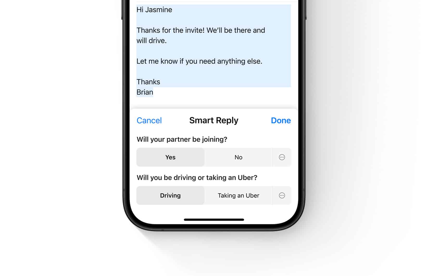 Dzięki Apple Intelligence będziesz teraz otrzymywać ulepszone sugestie odpowiedzi w aplikacji Wiadomości. Ta funkcja rozumie przebieg Twojej rozmowy i dostarcza trafnych odpowiedzi.