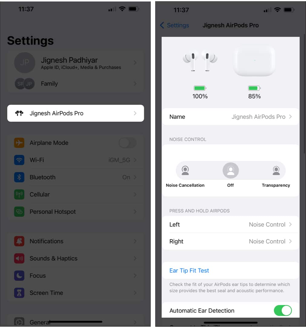 Dodatkowo wiOS 16, po nawiązaniu połączenia z AirPods Pro wykonaj następujące czynności: Przejdź doUstawienia→ Stuknij wAirPods Prowłaśnie pojawiło się w menu → DostosujTryb przejrzystości.