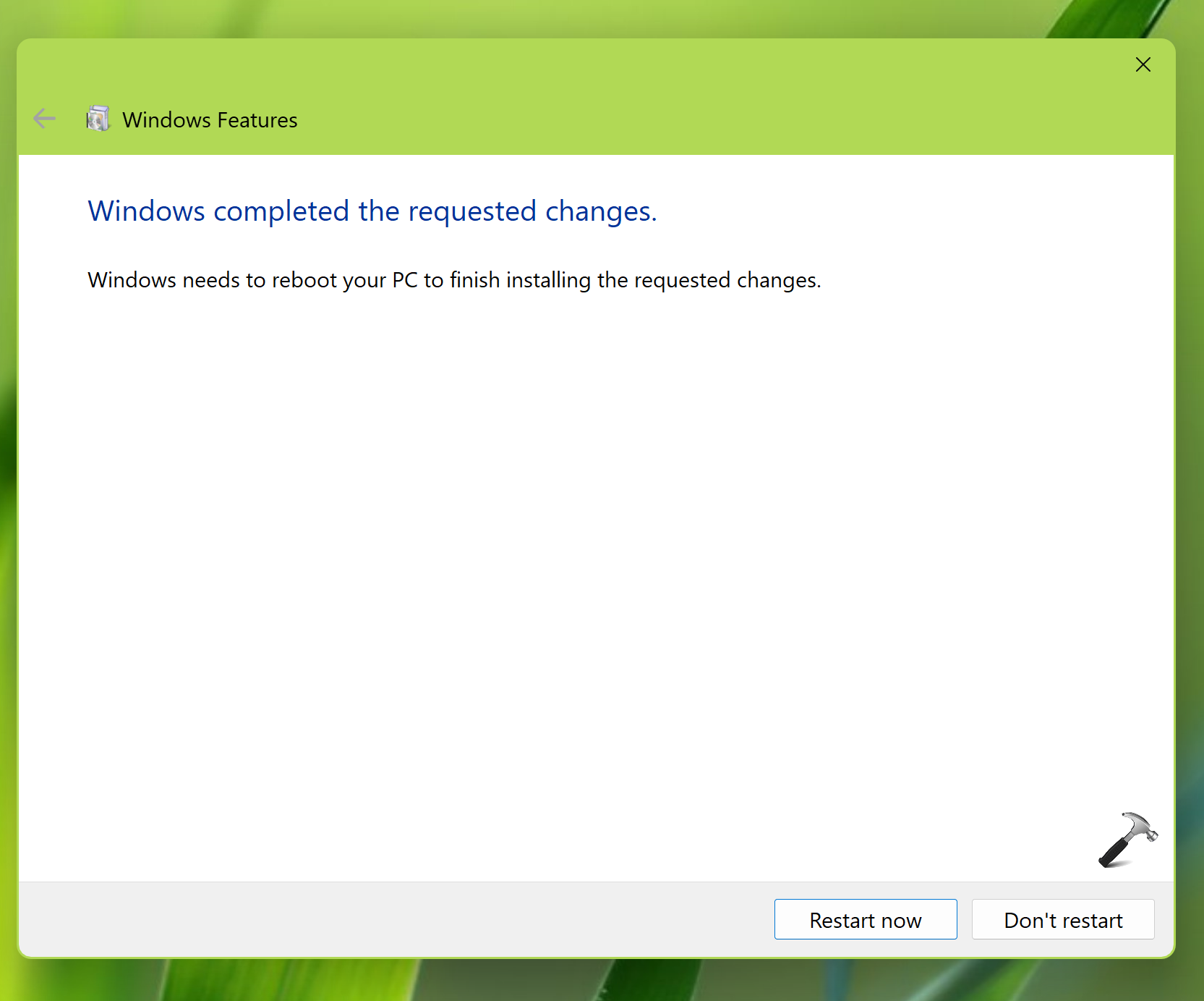 4. Za kilka chwil zostaniesz powiadomiony, że funkcja powinna być włączona po ponownym uruchomieniu, a system Windows będzie musiał w końcu ponownie uruchomić system, aby móc korzystać z tej funkcji. Kliknij Uruchom ponownie teraz.