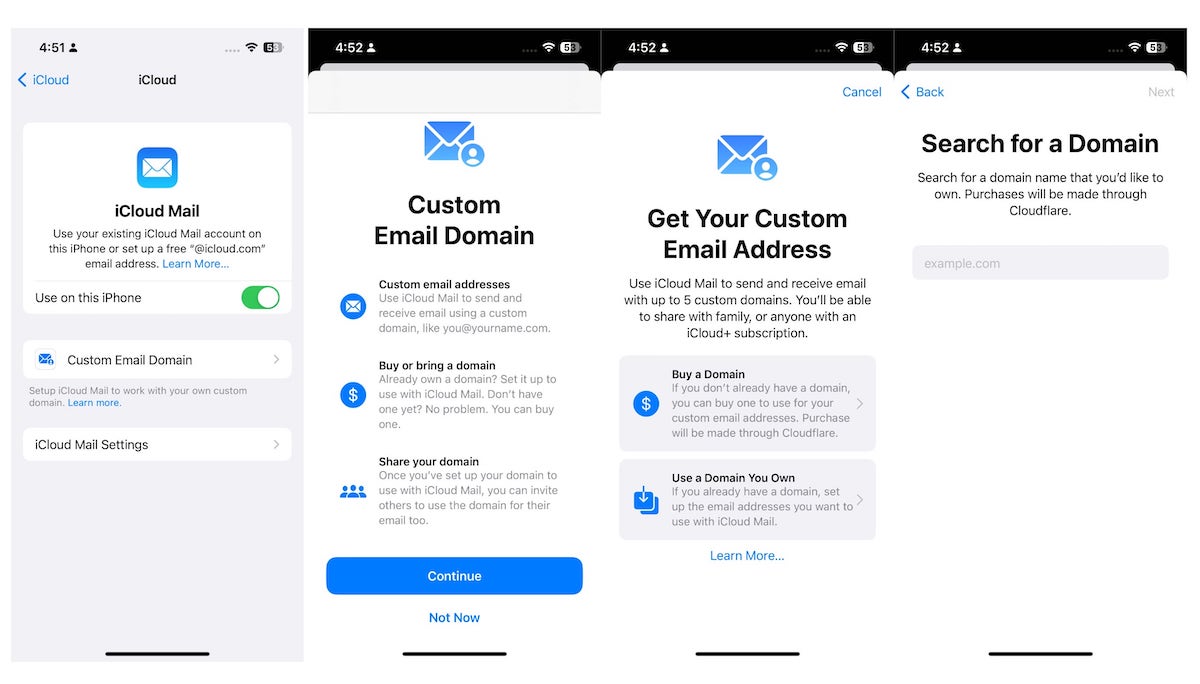 Później firma wprowadziła obsługę spersonalizowanego adresu e-mail w iCloud Mail dla abonentów iCloud+ w iOS 16. Ta funkcja umożliwia użytkownikom tworzenie niestandardowych domen w celu zarządzania adresami e-mail z jednej skrzynki odbiorczej.