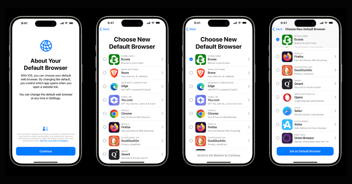 Kolejna istotna aktualizacja dotyczy ekranu wyboru przeglądarki. Jabłkoujawniłże przeprojektowuje ten ekran, aby zapewnić bardziej szczegółowe informacje o alternatywnych przeglądarkach i będzie on wyświetlany wszystkim użytkownikom, którzy mają przeglądarkę Safari ustawioną jako domyślną. Celem jest ułatwienie użytkownikom przełączania się na inną przeglądarkę, rozwiewając obawy, że poprzedni projekt Apple utrudniał odejście od Safari.