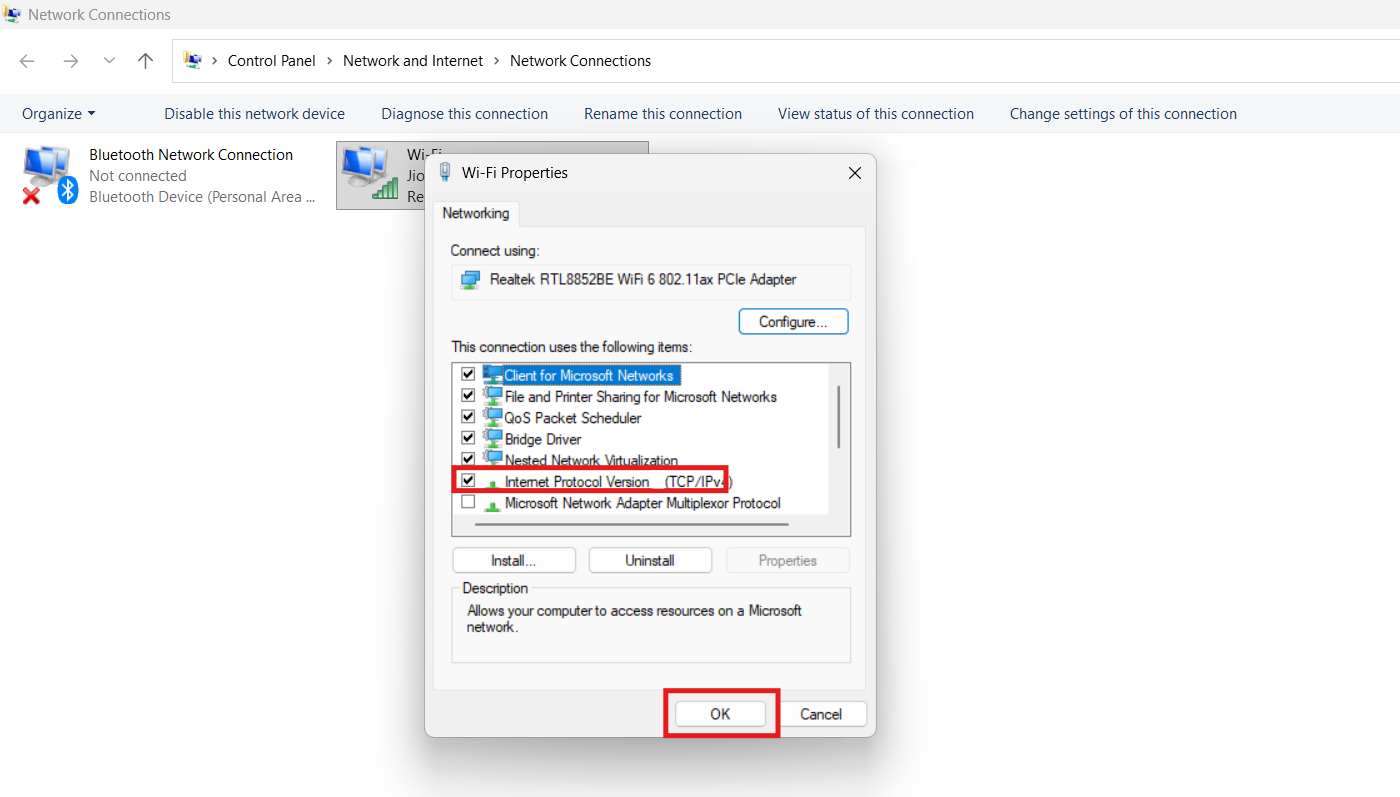 4. Poczekaj 10 sekund, ponownie otwórz Właściwości, sprawdź ponownie wersję protokołu internetowego 6 (TCP/IPv6) i wybierz OK.