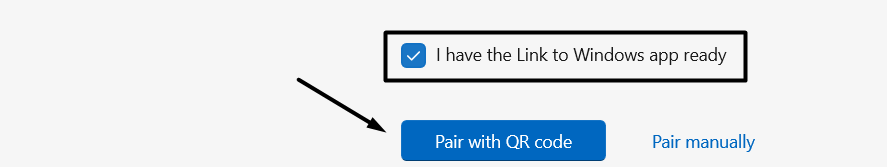 6.Teraz, najpierw sprawdźMam przygotowaną aplikację Link to Windowspole wyboru, a następnie kliknij przyciskSparuj z kodem QRopcja.