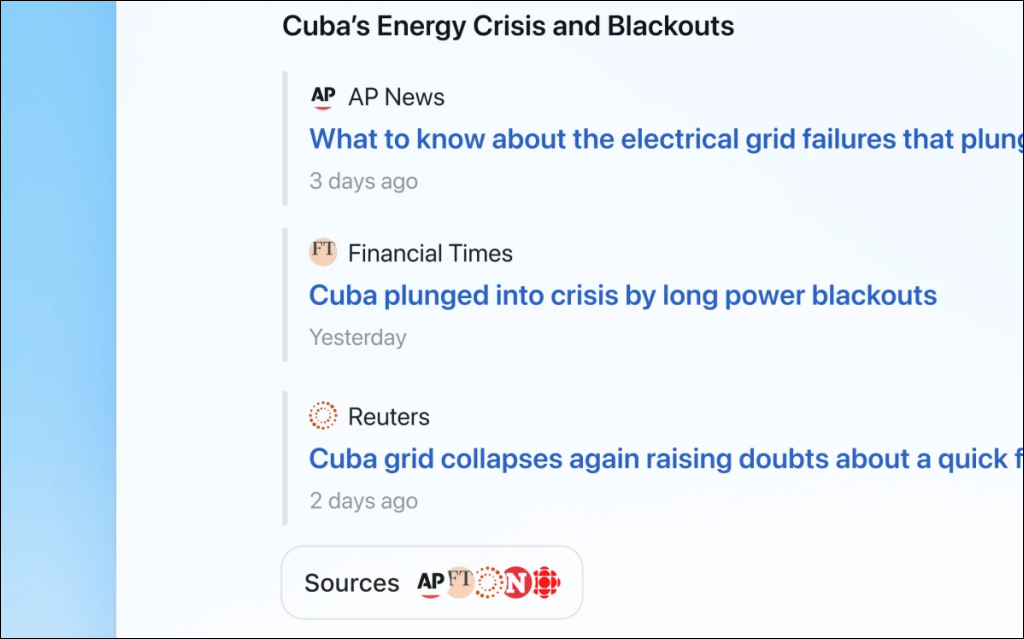 Wybranie przycisku „Źródła” spowoduje otwarcie bocznego paska cytatów pokazującego dokładnie, skąd pochodzą odpowiedzi chatbota. Na pasku bocznym będą znajdować się linki do źródeł internetowych (posty na blogu, artykuły, fora itp.) i daty ich publikacji.