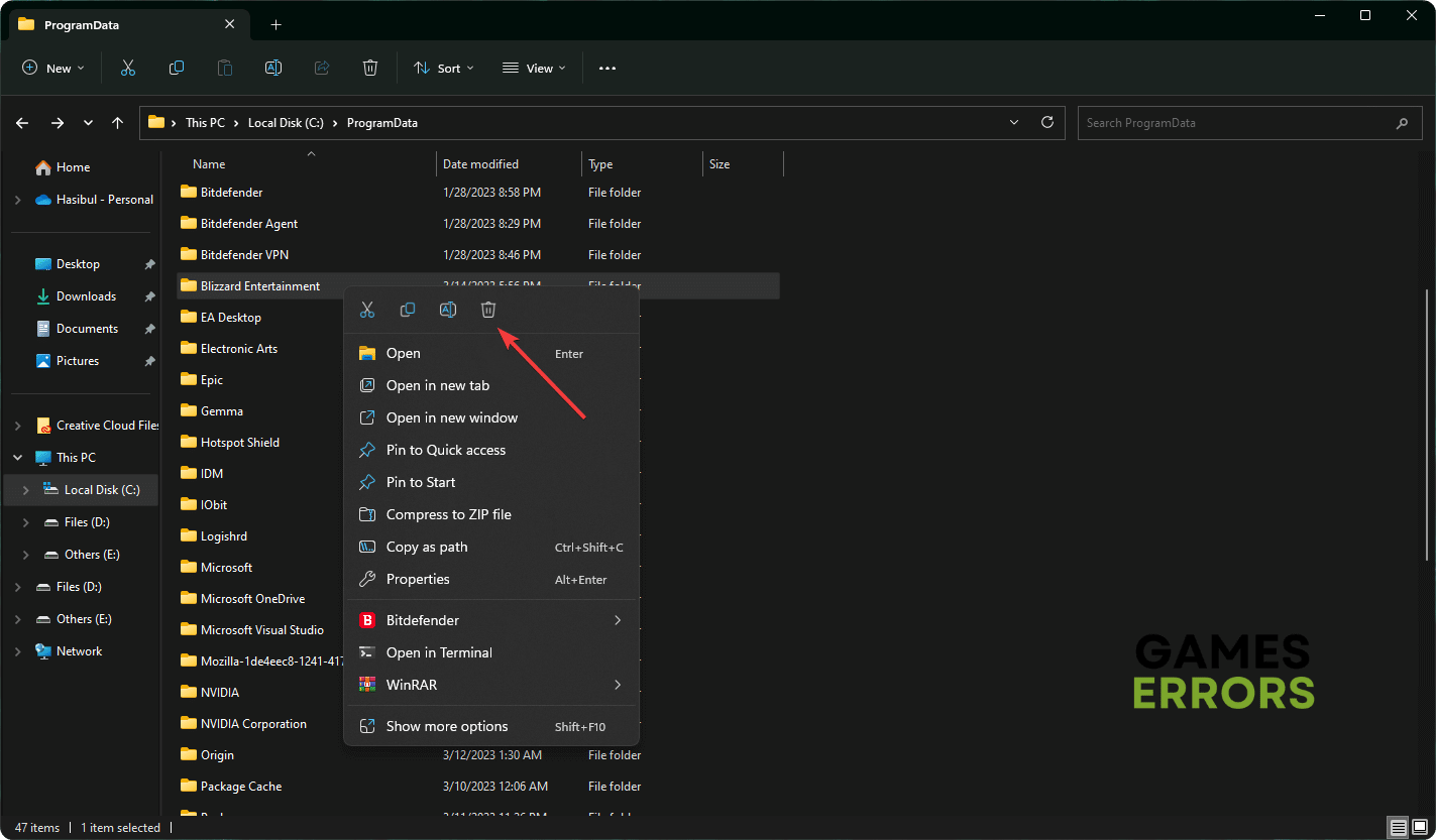 - ZlokalizujRozrywka Blizzardafolder i usuń go.