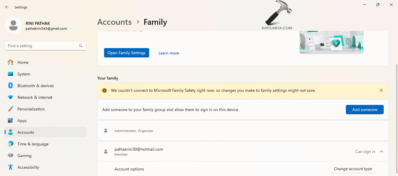 Krok 6-Ponownie przejdź do Konta > Rodzina i inni użytkownicy. Następnie wybierz nowe konto i wybierz opcję Zmień typ konta.