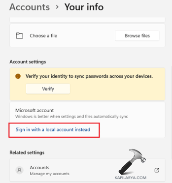 Krok 2-Teraz poniżej Ustawień kont wybierz Twoje informacje > Zamiast tego zaloguj się na konto lokalne.