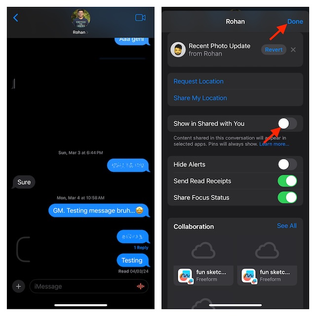 Ale co, jeśli nie chcesz całkowicie wyłączać tej funkcji udostępniania i wolisz uniemożliwić konkretnemu wątkowi czatu iMessage wyświetlanie udostępnionych łączy, obrazów lub notatek w obsługiwanych aplikacjach? Zgadnij co, ty też możesz to zrobić.
