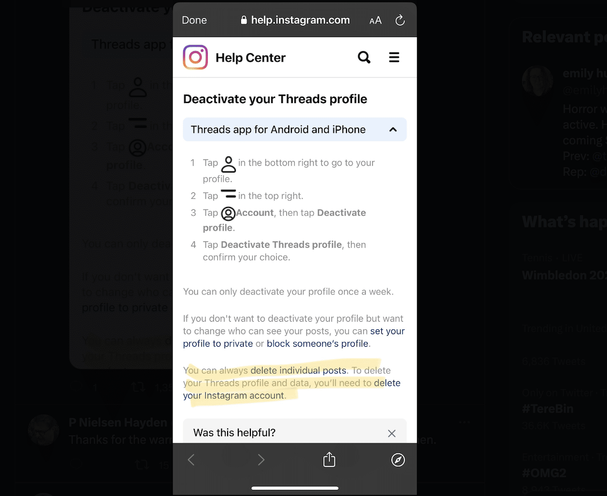 Użytkownik Twittera@Emily Hughesodkryło, że chociaż utworzenie profilu w Threads jest łatwe, jego usunięcie nie jest łatwe. W instrukcjach aplikacji dotyczących dezaktywacji profilu jest napisane, że będą musieli również usunąć swoje konto na Instagramie.
