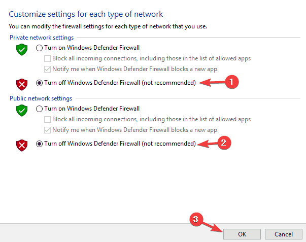 - Teraz wybierzWyłącz Zaporę systemu Windows Defender (niezalecane)zarówno dla ustawień sieci publicznej, jak i prywatnej.