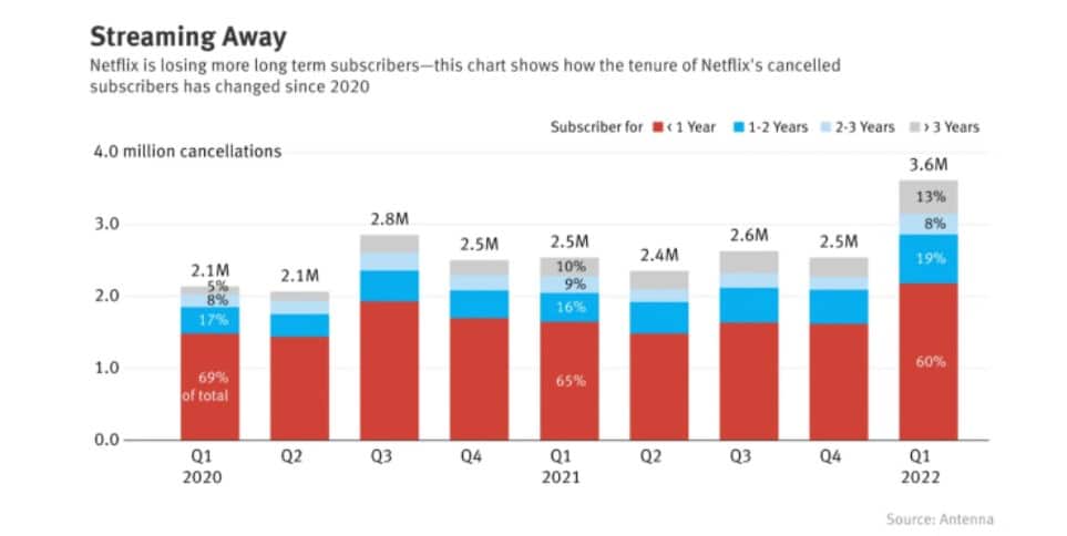 Według danych dostarczonych przez firmę badawczą Antenna toInformacje,użytkownicy, którzy byli abonentami od ponad trzech lat, stanowili 5% wszystkich rezygnacji na początku tego roku. Jednak w pierwszym kwartale liczba ta szybko wzrosła do 13%. Klienci długoterminowi stanowili 6%. Użytkownicy, którzy subskrybowali usługę krócej niż rok, stanowili 70%.