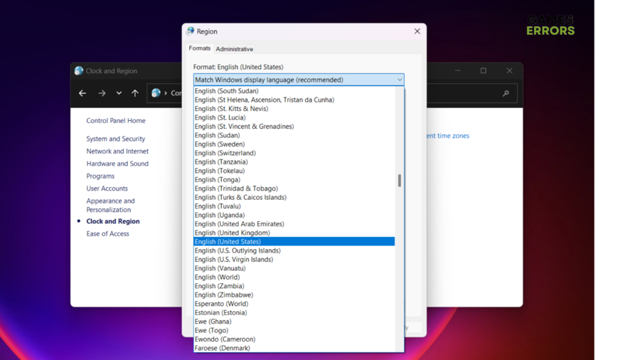4. Teraz idź doFormati wybierz z menu rozwijanego opcję Angielski (Stany Zjednoczone).