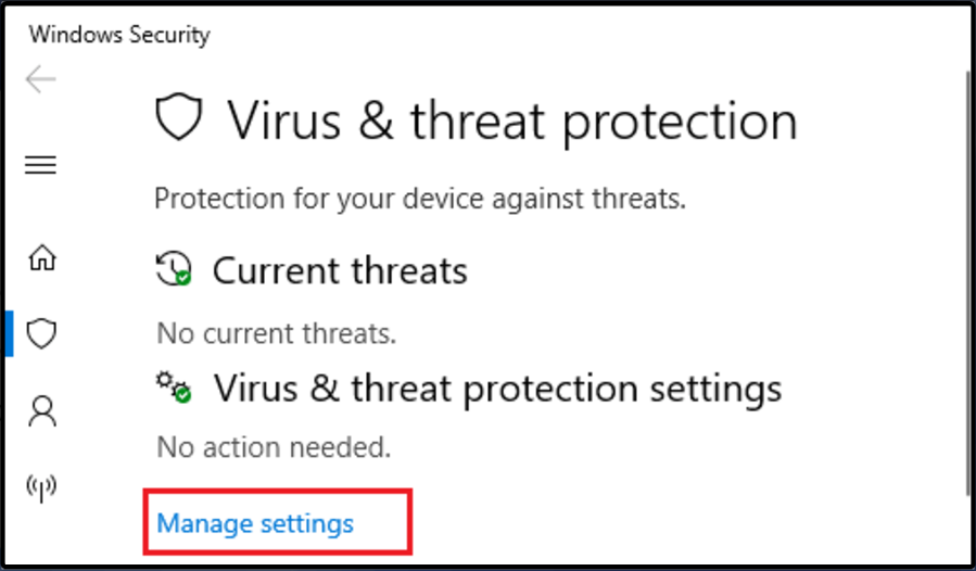 4. PoszukajUstawienia ochrony przed wirusami i zagrożeniamisekcję, a następnie wybierz opcję Zarządzaj ustawieniami.