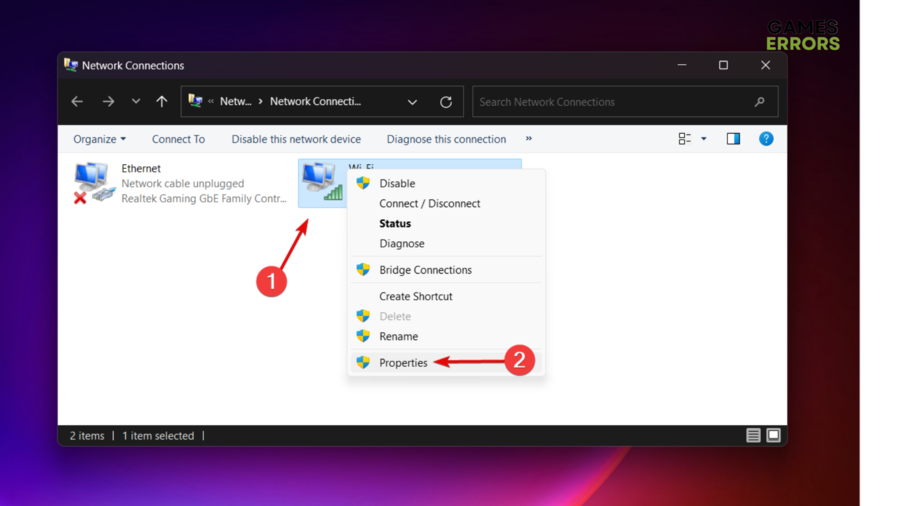 3. RazUstawienia sieciowezostanie otwarte, kliknij prawym przyciskiem myszy aktywną kartę sieciową, a następnie wybierz jej Właściwości.