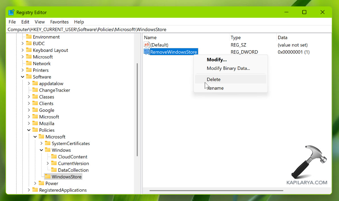 3. W prawym okienku WindowsStore kliknij prawym przyciskiem myszy Usuń rejestr DWORDWindowsStore.
