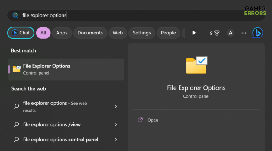 1. Naciśnij klawisz Windows, wpiszOpcje Eksploratora plikówi kliknij pierwszy wynik.