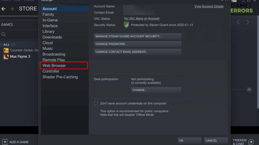 • Dane przeglądarki internetowejLubPamięć podręczna HTML– Problemy z ładowaniem sklepu Steam mogą również wystąpić z powodu uszkodzonej lub nieaktualnej pamięci podręcznej lub danych przeglądarki internetowej. Lepiej je wyczyścić.