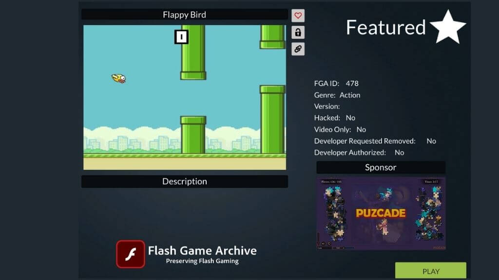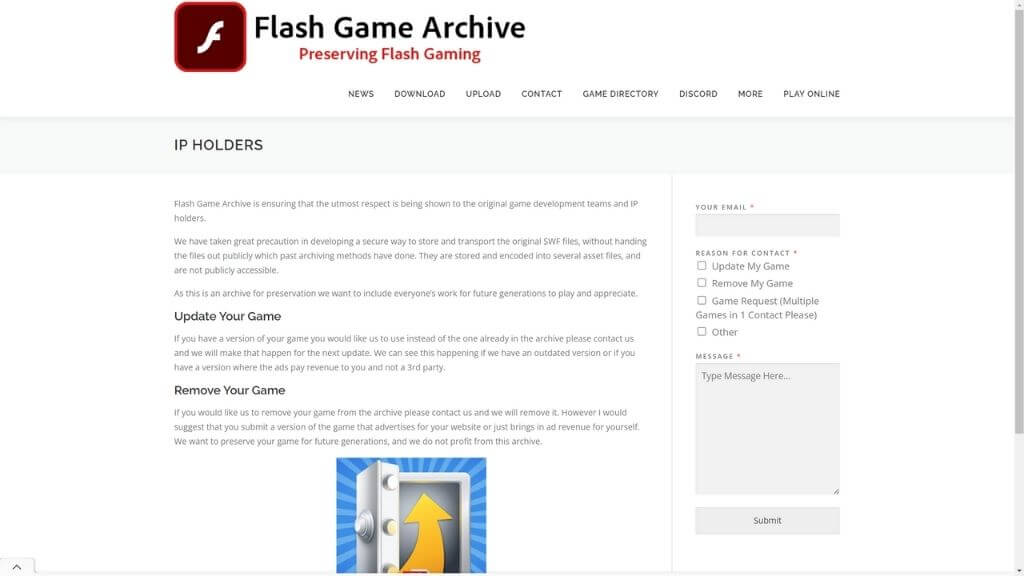Możesz przesłać gry Flash do archiwum, korzystając z opcji Prześlij na stronie internetowej. Wszystkie pliki wymagane do uruchomienia gry muszą zostać skompresowane do jednego pliku ZIP i przesłane przy użyciu tej strony. O ile nam wiadomo, bezpośrednie prośby o dodanie gier do archiwum są zarezerwowane dla subskrybentów FGA Patreon.