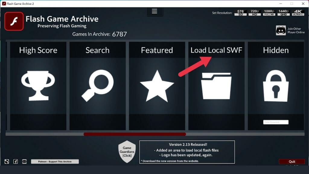 Jeśli masz własne pliki gier SWF Flash, możesz je załadować bezpośrednio za pomocą aplikacji FGA. Wszystko, co musisz zrobić, to wybraćZaładuj lokalny plik SWFz głównego menu aplikacji.
