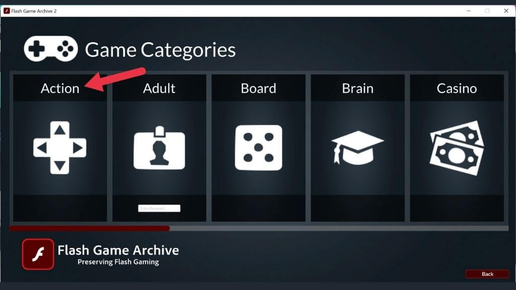Chociaż FGA służy głównie do przechowywania i umożliwiania nam grania w gry flash, istnieje również zbiór animacji Flash. Mogą one być interaktywne, ale nie są grami. Mimo to mają one tę samą ogólną wartość historyczną co gry Flash, a większość historii kultury internetowej jest zamknięta w tych animacjach. Jeśli chcesz zobaczyć kolekcję animacji FGA, przewiń ekran główny w prawo, aby je wyświetlić.