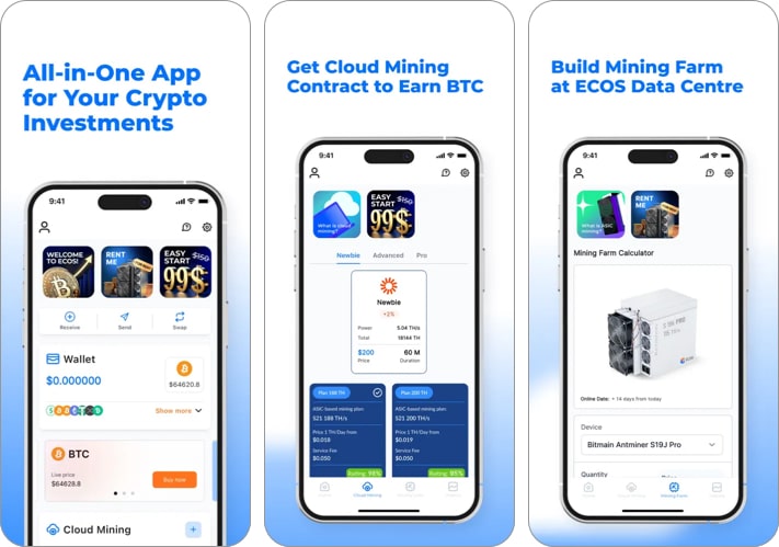 Jest to pierwszy start-up fintech w stylu farmy wydobywczej, który otrzymał wsparcie od rządu USA. Umożliwia klientom zakup stawek skrótu i czerpanie zysków z eksploracji w chmurze za pośrednictwem własnego centrum danych w Armenii. ECOS oferuje 150 dolarów jako minimalną kwotę kontraktu wydobywczego. Możesz prowadzić dokładny rejestr wszystkich swoich transakcji, a otrzymasz zapłatę każdego dnia. Korzystanie z tego oprogramowania kosztuje 50 dolarów.