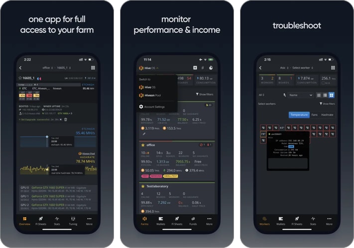 Hive OS umożliwia użytkownikom konfigurowanie i zarządzanie operacjami wydobywczymi na setkach platform wydobywczych. Oprogramowanie automatycznie wyszukuje platformy po pobraniu i wyświetla ich szczegółowe informacje na pulpicie nawigacyjnym, co ułatwia zarządzanie. Za pomocą jednego kliknięcia Hive OS umożliwia monitorowanie aktywności wydobywczej w wielu pulach.