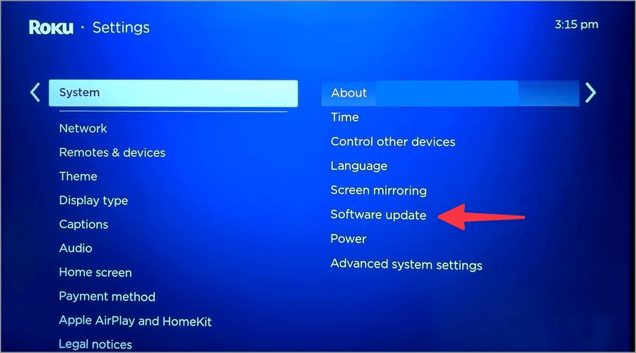 Krok 2:Wybierz opcję Aktualizacja oprogramowania, a następnie zainstaluj najnowszą wersję RokuOS.