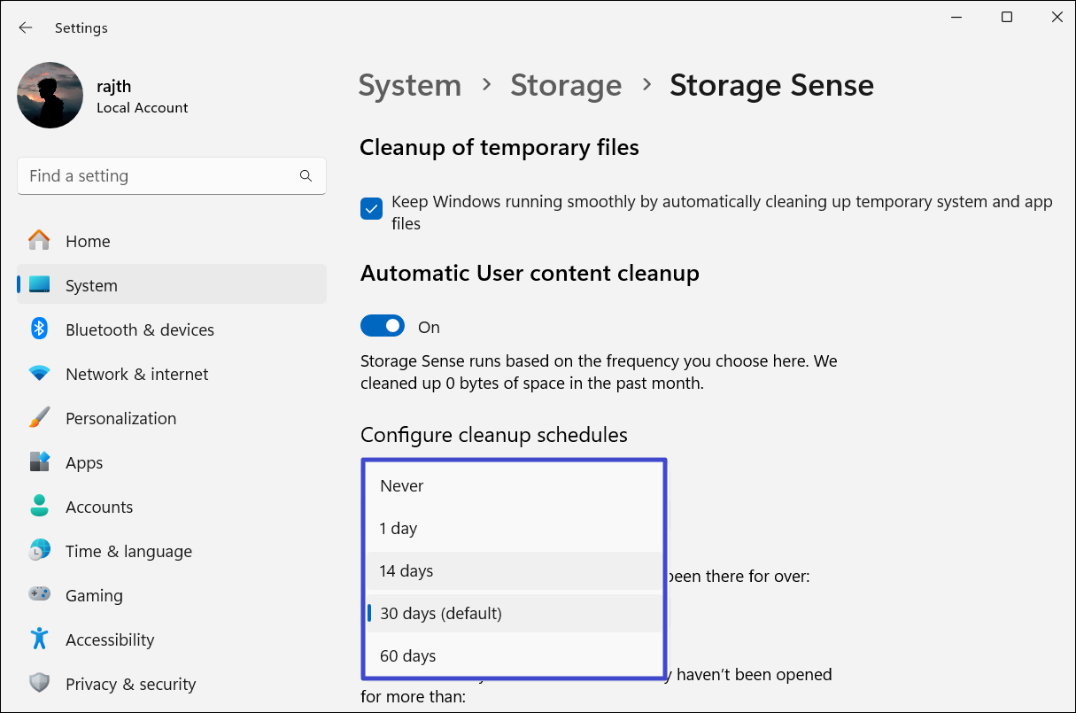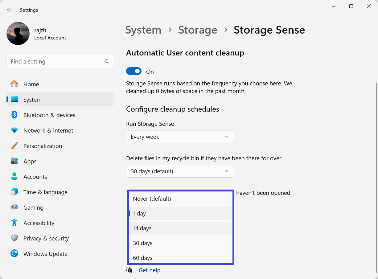 7. Na koniec użyj„Usuń pliki z mojego folderu Pobrane…”menu rozwijanego, aby wybrać, ile dni pliki mogą pozostać nieotwarte, zanim zostaną automatycznie usunięte.