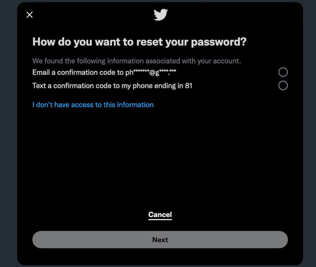- Jeśli masz konto powiązane z Twitterem, możesz otrzymać kod potwierdzający e-mailem lub SMS-em. Wybierz jedną z tych opcji i dotknijNastępny.