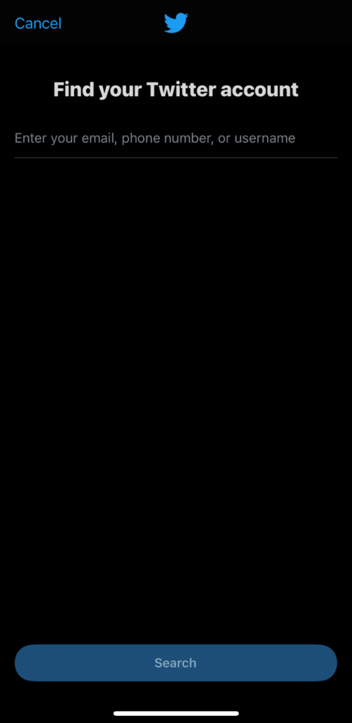 - Wpisz swoją nazwę na Twitterze, numer telefonu lub adres e-mail i dotknijSzukaj.