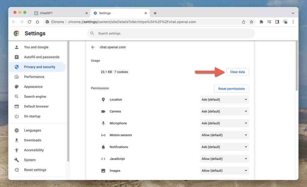 Przestarzała pamięć podręczna przeglądarki to kolejny powód prowadzący do konfliktów i błędów w ChatGPT. Rozpocznij od wyczyszczenia pamięci podręcznej powiązanej ze stroną ChatGPT. Zakładając, że używasz przeglądarki Google Chrome: