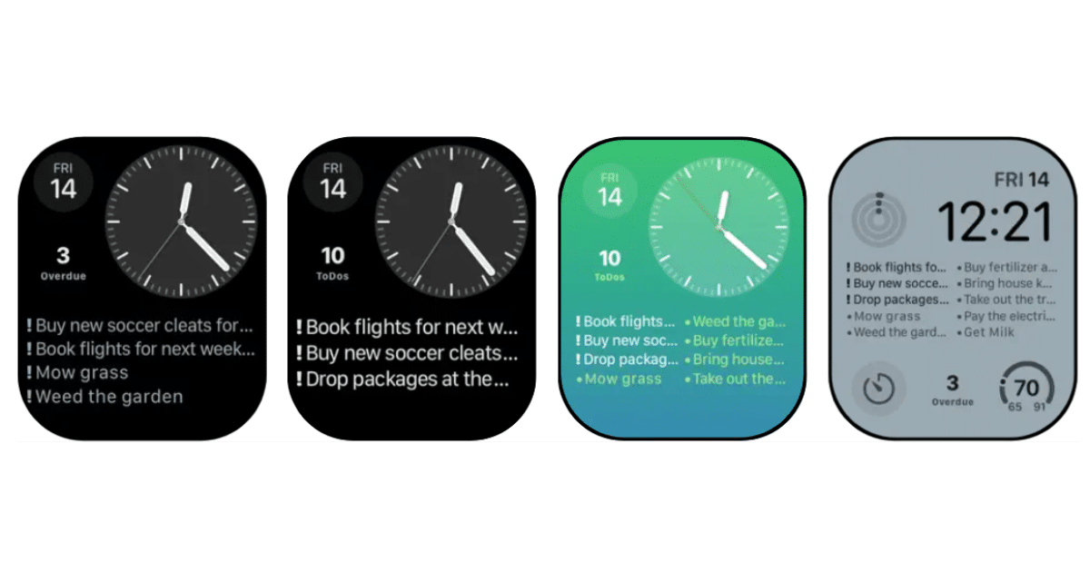 Okrągłe komplikacje mogą wskazywać liczbę zaległych lub nadchodzących przypomnień w danym dniu, zapewniając szybki przegląd zadań. Co więcej, masz wybór pomiędzy użyciem koloru tła lub pozostawieniem standardowego czarnego tła, z dostosowaniem tekstu przypomnienia w celu zapewnienia widoczności.