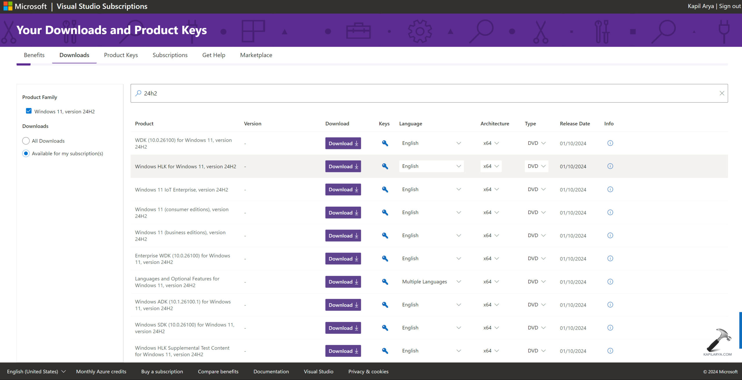 Jeśli masz opłaconą subskrypcję programu Visual Studio, możesz w dowolnym momencie pobrać plik ISO systemu Windows 11 24H2 z poziomu pobrań subskrypcji. Po prostu wyszukaj „24h2”, a tam otrzymasz media 24H2.