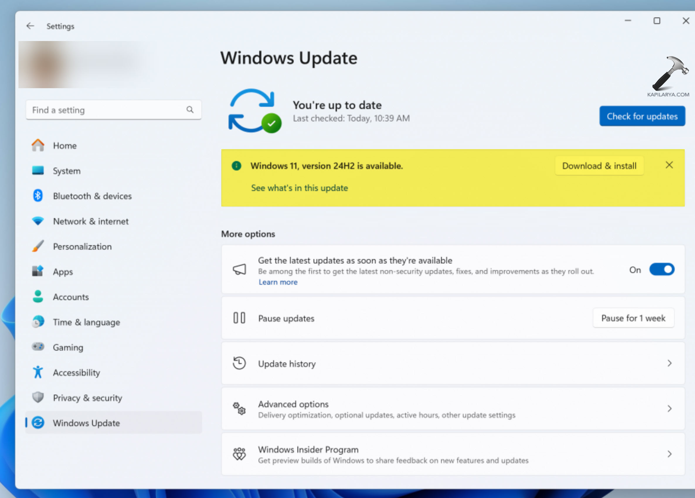 Pobierz system Windows 11 w wersji 24H2 z aplikacji Ustawienia, strona aktualizacji.