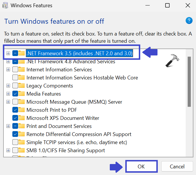 Zaznacz pole „.NET Framework 3.5”. Kliknij OK.