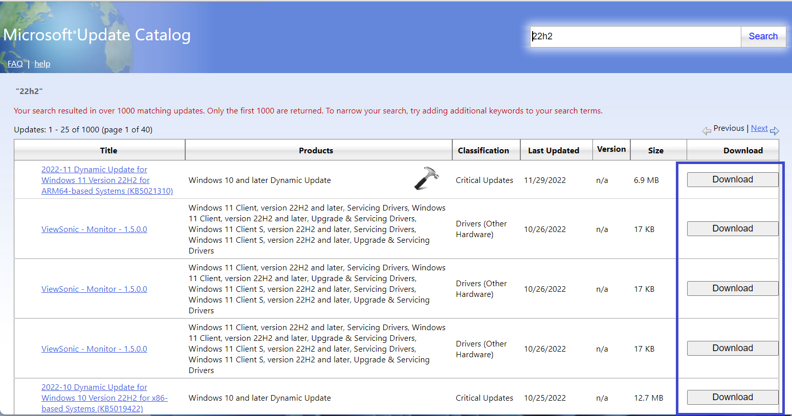 3. Wpisz numer kodu aktualizacji w pasku wyszukiwania, a pojawi się lista.