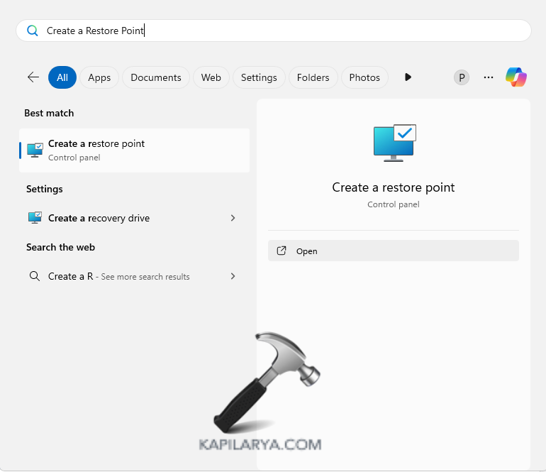 Krok 1-Najpierw odwiedź menu Start i wyszukaj opcję Utwórz punkt przywracania. Wybierz pierwszy wynik.