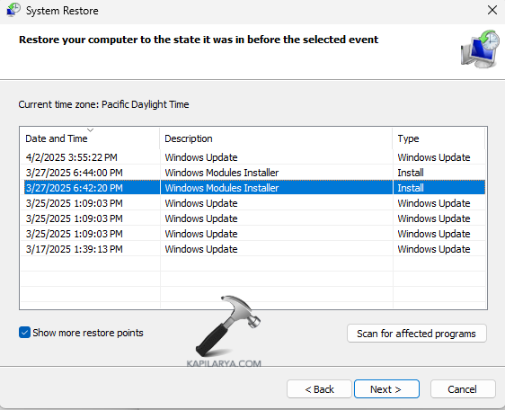 Krok 3-Teraz z punktów przywracania wybierz żądany, do którego chcesz przywrócić komputer, i naciśnij Dalej.