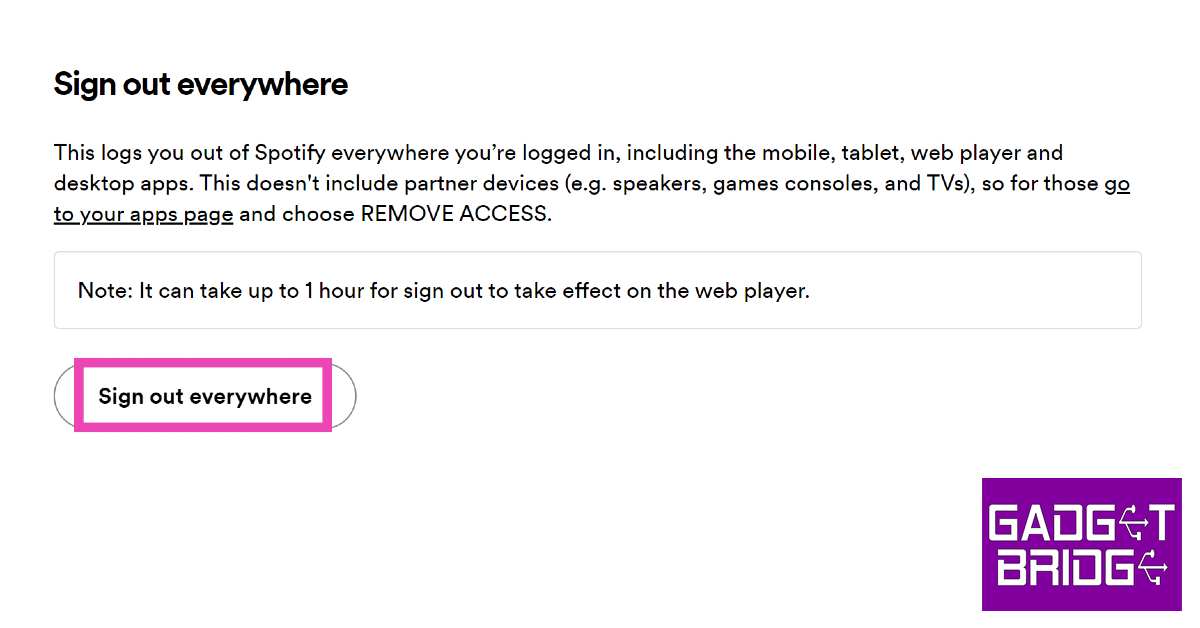 Najczęstszą przyczyną losowego wstrzymywania muzyki na Twoim komputerzejest konflikt kont z innymi urządzeniami. Jeśli jesteś zalogowany na wielu urządzeniach przy użyciu tego samego konta Spotify, może to zakłócać odtwarzanie muzyki. Przejdź do strony swojego konta Spotify i wyloguj się ze wszystkich urządzeń.