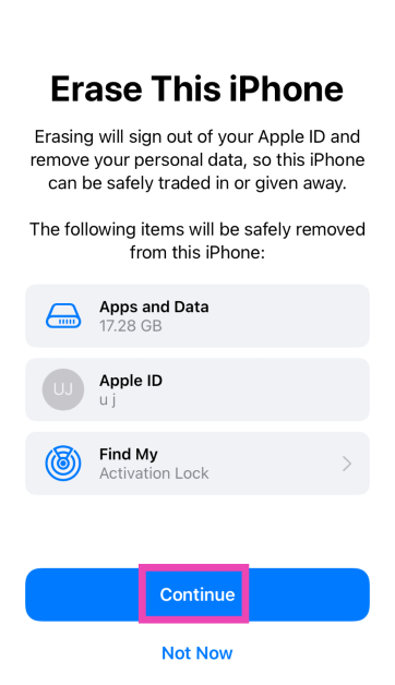 Krok 4:KliknijKontynuowaći wprowadźhasłoaby zresetować iPhone'a do ustawień fabrycznych.