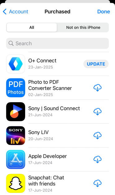 Krok 4:Znajdź aplikację, którą chcesz zaktualizować. Jeśli nie możesz znaleźć aplikacji na liście, musisz zalogować się przy użyciuIdentyfikator Appleże go pobierałeś.
