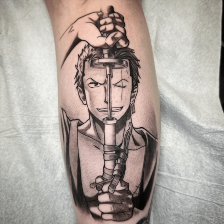 Dla oddanych fanów One Piece, którzy obejrzeli ponad 1000 odcinków, wykonanie tatuażu inspirowanego anime to pestka. Ten tatuaż składa hołd wojownikowi Roronoa Zoro, przedstawiając jego kultową bliznę nad lewym okiem i rękojeści jego trzech mieczy.