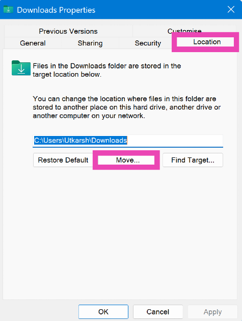 Uruchom Eksplorator plików (Windows + E), kliknij prawym przyciskiem myszy folder Pobrane i przejdź do „Właściwości”. Przejdź na kartę Lokalizacja, przejdź do opcji Przenieś i przejdź do preferowanego folderu docelowego, aby pobrać pliki internetowe. Kliknij „Wybierz folder”. Naciśnij „Zastosuj”.