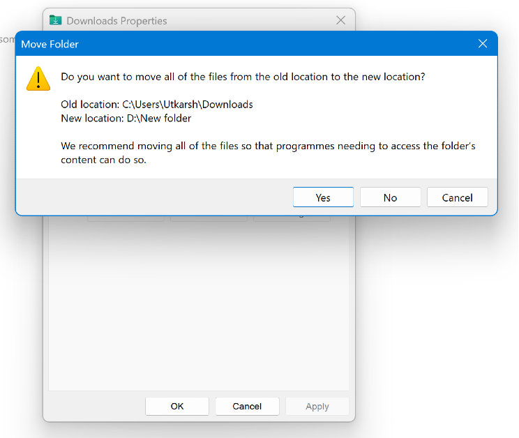 Krok 6:KliknijTakjeśli chcesz przenieść bieżące pliki do nowego folderu docelowego.