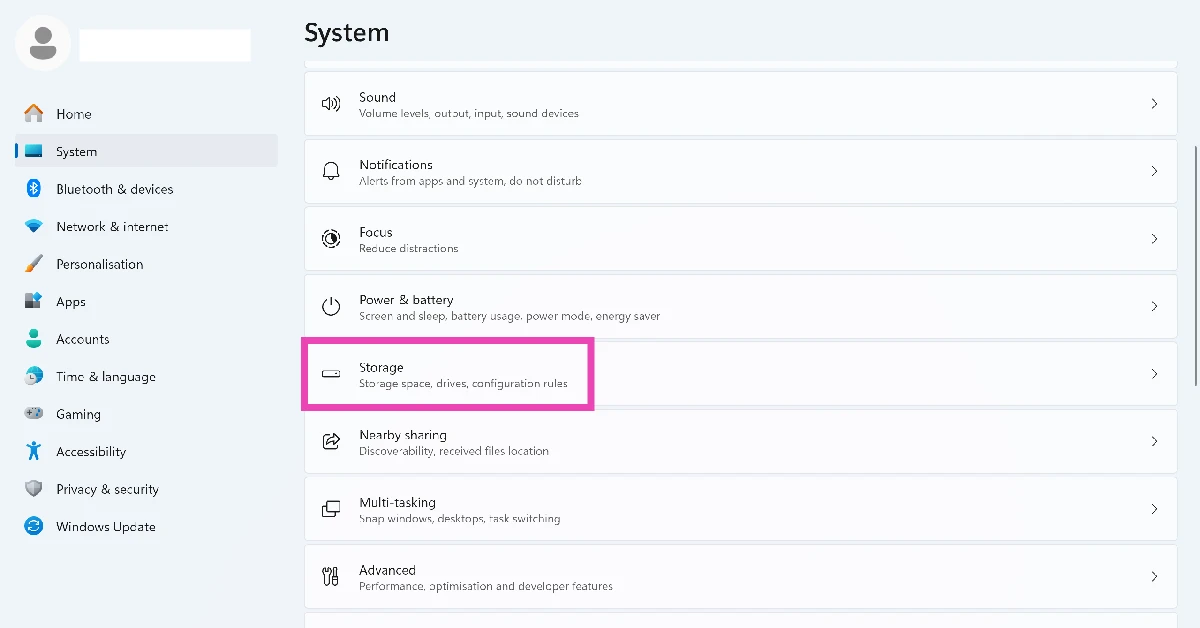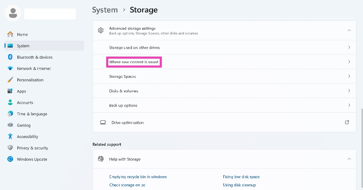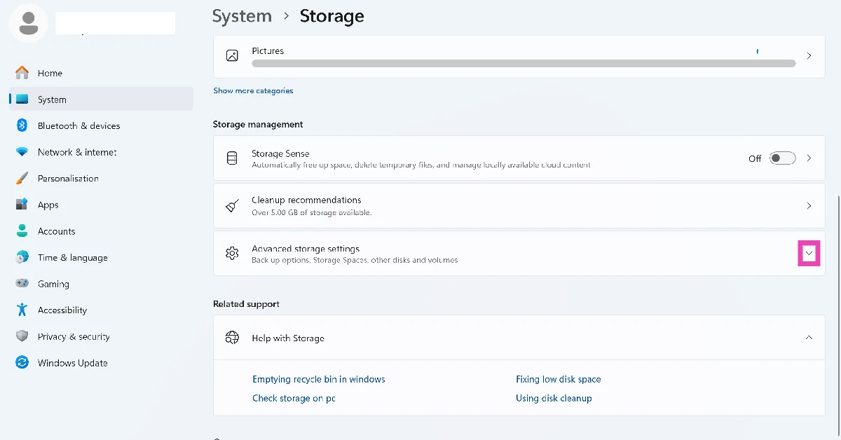 Krok 3:Naciśnij strzałkę obokZaawansowane ustawienia przechowywaniaaby go rozwinąć.
