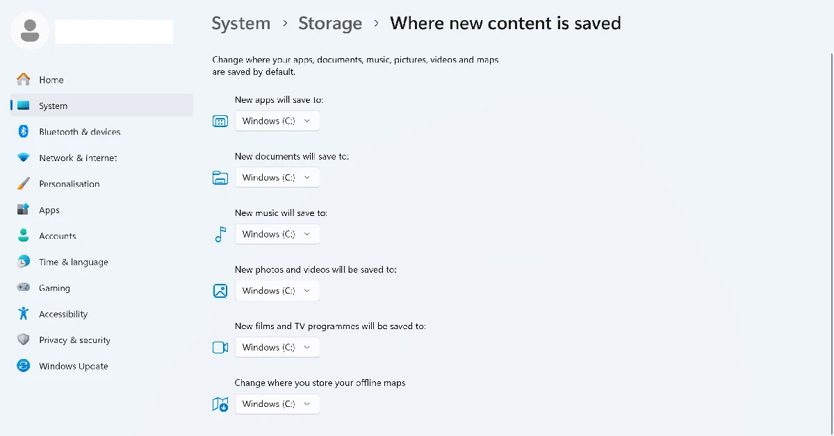 Ustawienia komputera: Centralne ustawienia komputera umożliwiają przypisywanie różnych dysków do nowych aplikacji, dokumentów, muzyki, zdjęć i filmów, filmów i programów telewizyjnych oraz map offline.